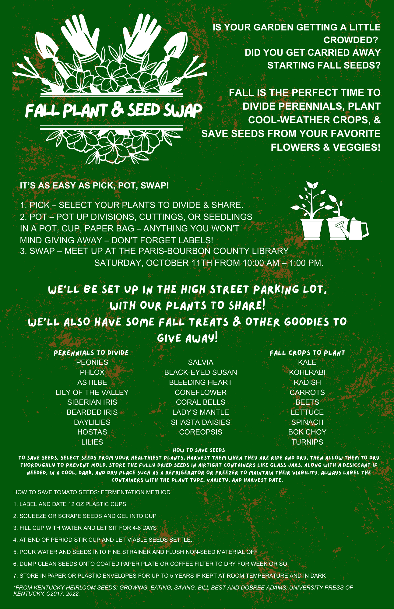 Kentucky heirloom seeds : growing, eating, saving / Bill Best with Dobree Adams – Call No 631.5 BEST